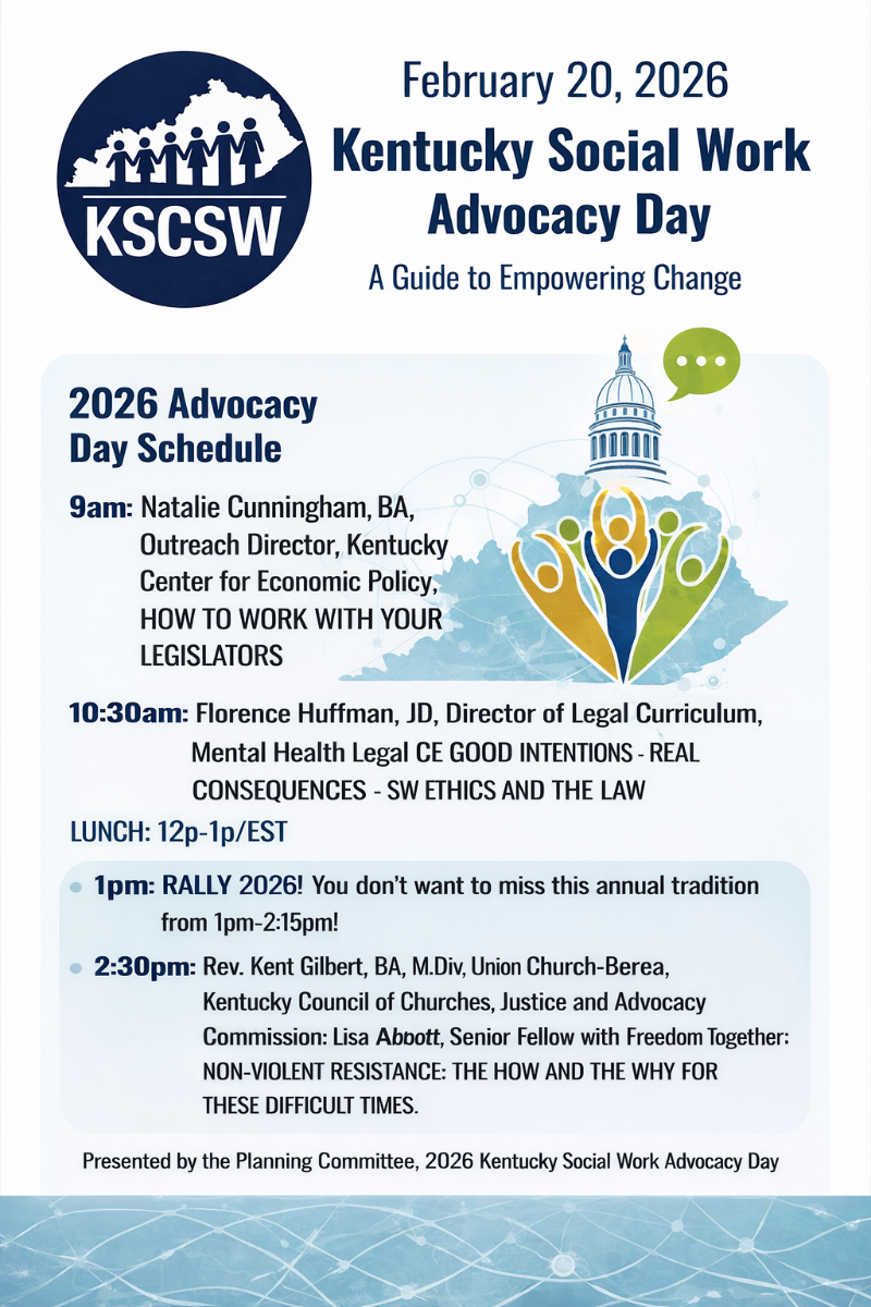 2026 SOCIAL WORK ADVOCACY DAY WILL BE HELD ON FRIDAY, FEBRUARY 20, 2026. On behalf of KSCSW, KASSW, KASWE, NABSW-KY, and KSWAJL, we welcome YOU and all ideas and energies so we can build a fantastic celebration for social workers and students. Due to the construction in the Capitol Rotunda, the House and Senate chamber meetings closed to the public, and the lack of committee meeting rooms to adequately hold hundreds of people, we are scheduling a virtual programming that will offer CE's for multiple presentations and panels to highlight the talents of Kentucky social workers, students, and collaborative partners.